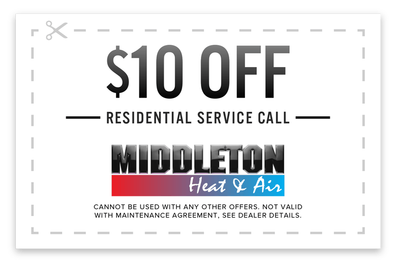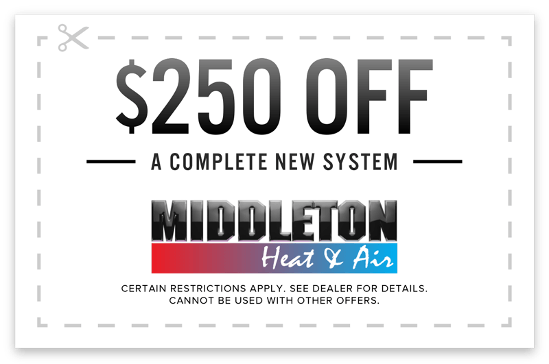 The following hvac specials are available for Middleton Heating & Air products and services. Print out each respective coupon and bring them into our store at your convenience, or call us for more information at 1-800-404-0371 today.